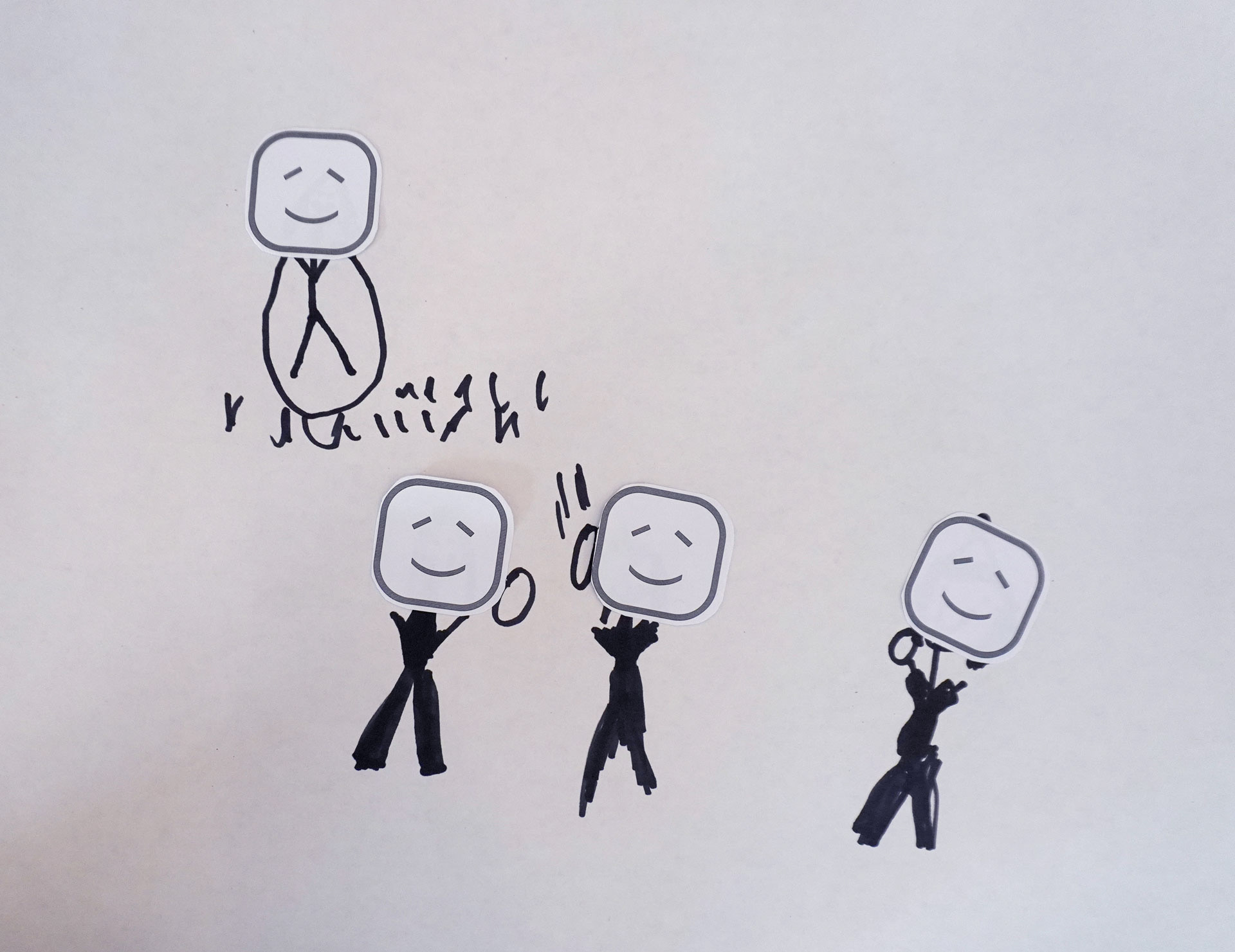 När vi först introducerade beskrivningar av platser använde vi ord som ”aktiv”, ”lugn”, ”en snabb plats”, ”en långsam plats” och så vidare. När vi insåg att det är svårt för barn att förstå dessa begrepp, eller att sätta ord på sina känslor inför en plats, omarbetade vi aktiviteten och använde emoticons. Barnen kunde då mer intuitivt välja och placera uttryckssymboler på sina teckningar för att beskriva hur de känner sig när de befinner sig på dessa platser.